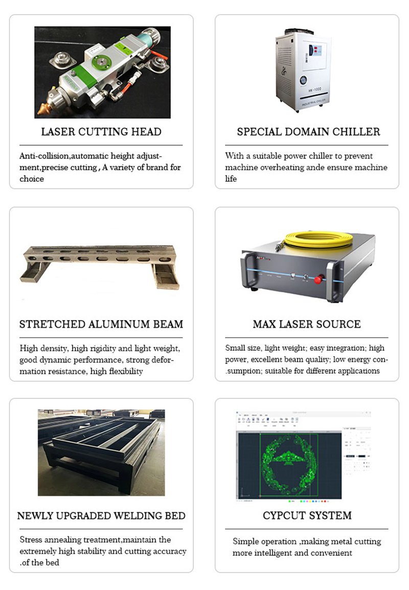 Die Faserlaserschneidemaschine 3015 verwendet importierte Original-Servomotoren, Untersetzungsgetriebe, Führungsschienen usw. Der original importierte Schneidkopf wird in Kombination mit Hochgeschwindigkeits- und Hochpräzisionszubehör verwendet, um die Schnittqualität sicherzustellen. Hochpräzises Zahnradschleifen, importierte Führungsschienen, importierte Schneidköpfe usw. wurden strengen Montageprozessen unterzogen, um die Geschwindigkeit und Genauigkeit der Maschine sicherzustellen. Der Laser kann je nach Kundenwunsch ausgewählt werden.