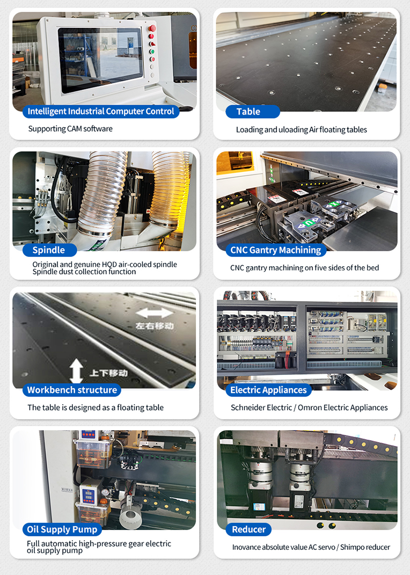 Die Sechsseitenbohrmaschine verfügt über die Funktionen Bohren, Schlitzen, Rundfräsen und Fräsen. Der Rahmen wird von einem CNC-Portalbearbeitungszentrum präzise bearbeitet. Es wird die original authentische luftgekühlte HQDKW-Spindel verwendet, die die Funktion der Staubsammlung hat. Das Hochleistungsbett verfügt über eine integrierte Schweiß-, Glüh- und Alterungsbehandlung.