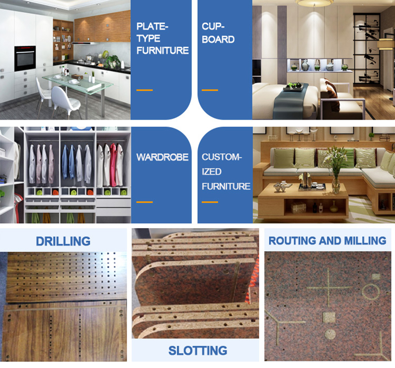 Wird hauptsächlich in der Plattenmöbelindustrie verwendet und hauptsächlich zum sechsseitigen Räumen (Scharnierlöcher, Durchgangslöcher, halbe Durchgangslöcher) und zum horizontalen Räumen verschiedener Holzwerkstoffplatten verwendet.